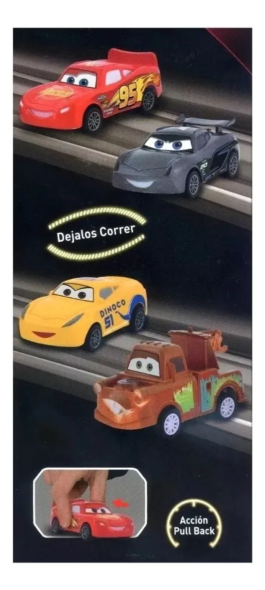 CARS CAJA X4 AUTTIOS PULL BACK RAYO MCQUEEN MATE DINOCO STORM